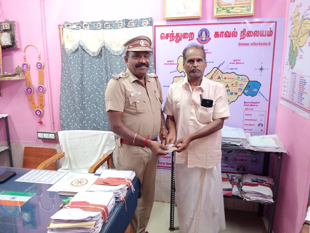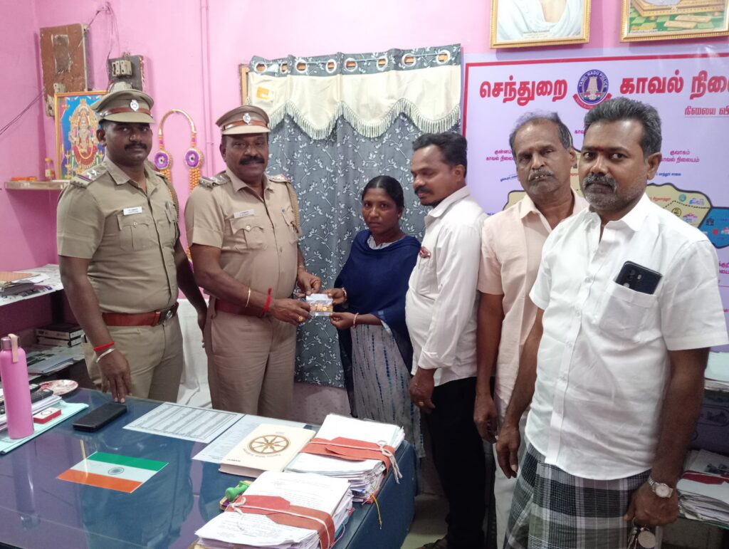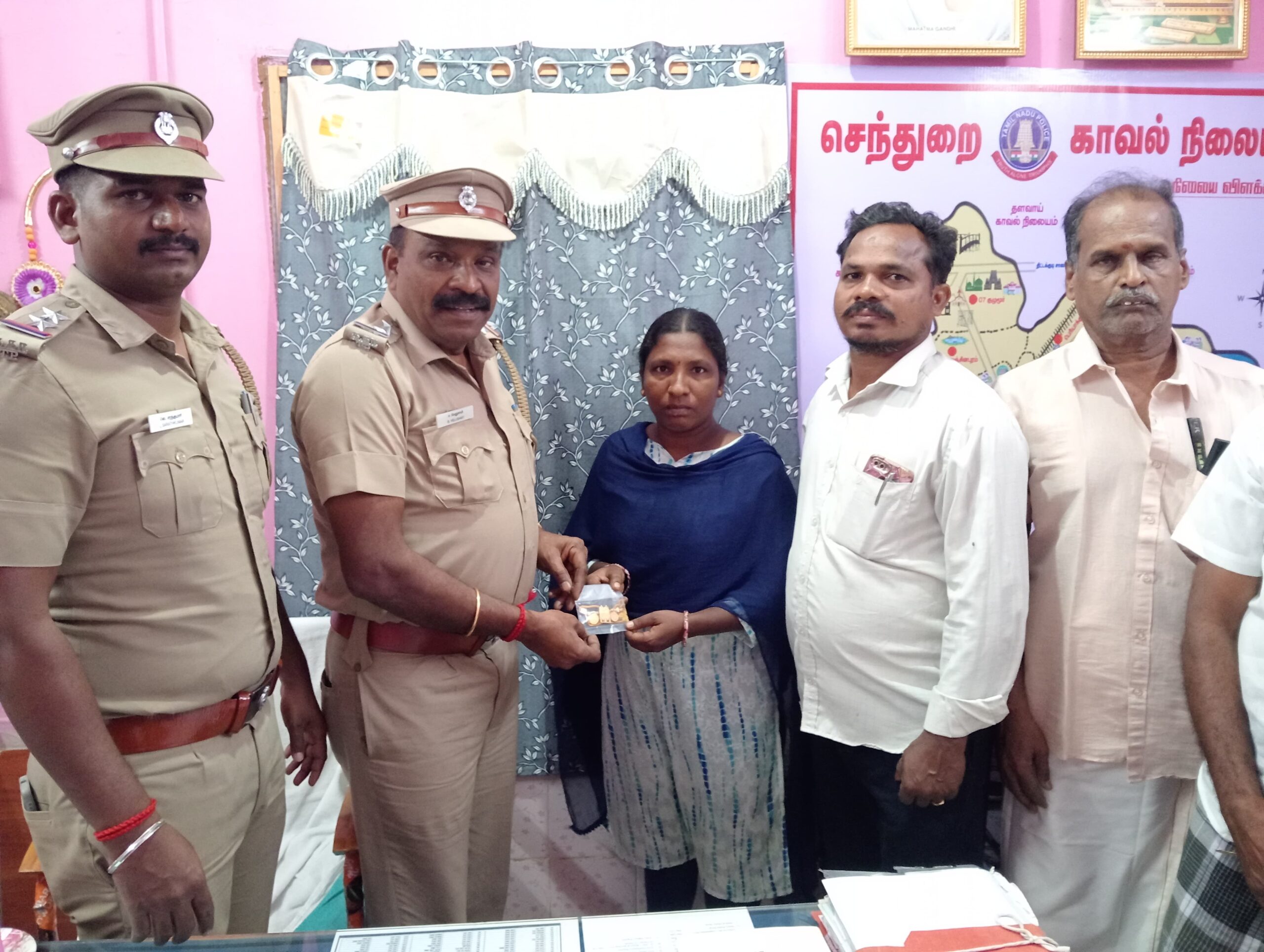நகையை தொலைத்த இளமதி தனது உறவினர்களோடு காவல்நிலையம் சென்று நகை தொலைந்து போன தகவலை கூற ஏற்கனவே கருப்புசாமி காவல் நிலையத்தில் ஒப்படைத்த நகையையும், இளமதி தொலைத்த நகையையும் காவல் ஆய்வாளர் ( பொ) வேலுச்சாமி, உதவி காவல் ஆய்வாளர் சரத்குமார் உள்ளிட்ட காவலர்கள் முன்னிலையில் சரிபார்க்கப்பட்டு நகையை தொலைத்த இளமதியிடம் ஒப்படைத்தனர். சுமார் ஒரு லட்சத்திற்கு மேல் மதிப்புடைய நகையினை எடுத்து சம்பந்தப்பட்டவரிடம் ஒப்படைக்க உதவிய நேர்மையாளர்கள் சந்திரசேகர் மற்றும் கருப்புசாமி ஆகியோர்களை செந்துறை காவல்துறையினரும் , பொதுமக்களும் பாராட்டினார்கள்.