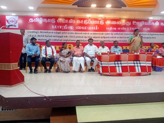 தமிழ்நாடு எஸ்டஸ் கட்டுப்பாடு அனைத்து ஊழியர் நலச்சங்க கோரிக்கையாக மணிப்பூர், இராஜஸ்த்தான், மற்றும் ஒரிசா மாநில அரசுகள் எய்ட்ஸ் கட்டுபபாட்டு திட்டத்தின் கீழ் பணிபுரியும் ஊழியர்களை பணி நிரந்தரம் செய்துள்ளதைப்போல் ….. தி.மு.க அரசின் தேர்தல் வாக்குறுதி எண் 153 ல் தி.மு.க ஆட்சிக்கு வந்தால் தமிழ்நாடு எய்ட்ஸ் கட்டுப்பாடு வாரியத்தில் பத்தாண்டு களுக்கு மேல் ஒப்பந்த அடிப்படையில் பணிபுரியும் ஊழியர்களை பணி நிரந்தரம். செய்வதாக தேர்தல் வாக்குறுதியில் அறிவித்ததை செயல் படுத்தி அறிவிக்க வேண்டுமென கோரிக்கை மாநாட்டில் வலியுறுத்தப்பட்டது. இம்மாநாட்டு கூட்டத்திற்கு காங்கிரஸ் சார்பில் மாமன்ற உறுப்பினர் ரெக்ஸ், வி.சி.க. கட்சியின் சார்பில் தமிழாதன் .இந்திய கம்னியூஸ்டு கட்சியின் சார்பில் எம். செல்வராஜ் மற்றும் எய்ட்ஸ் . மாநில நிர்வாகிகள் கருப்புசாமி ரவி இருதயராஜ் ஜெகஜோதி சுசிலா வில்சன் மணிவாசகன் முத்துராமலிங்கம் கண்ணன் மீனா முருகதாசன் மற்றும் மாவட்ட நிர்வாகிகள் கலந்து கொண்டனர் நிறைவுறையாக பாலசுப்பிரமணியன் நன்றி உரையாக பி. ரமேஷ் ஆகியோர் கலந்து கொண்டு தமிழ்நாடு அரசுக்கு தங்கள் கோரிக்கைகளை முன்வைத்தனர் . நிறைவேற்றுமா? தமிழக அரசு|