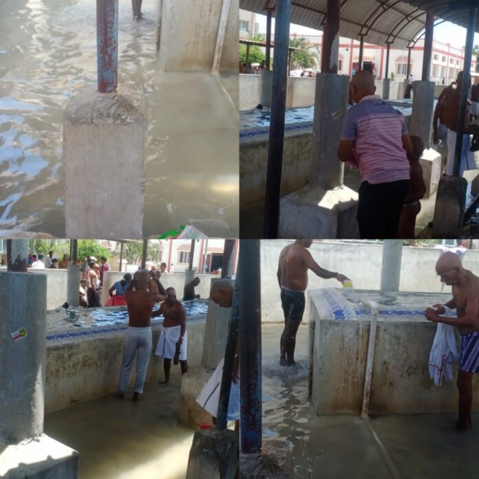 திருச்சி சமயபுரம் கோவிலில் பக்தர்கள் முடி காணிக்கை செலுத்திய பின் குளிக்க செல்லும் இடத்தில் நீர்த்தேக்கம்….!