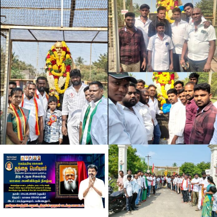 தமிழக வெற்றிக் கழகத்தின் கொள்கை தலைவர் பகுத்தறிவு பகலவன் பெரியாரின் நினைவு நாளை முன்னிட்டு திரு உருவ சிலைக்கு மாலை அணிவிக்கப்பட்டது. துறையூர் தமிழக வெற்றிக் கழகம்