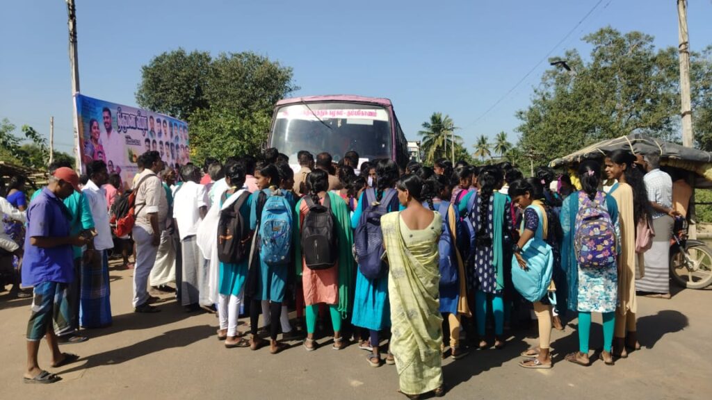 வேன், மோட்டார் சைக்கிள்களில் உதவி கேட்டு செல்கின்ற நிலை உள்ளது மேலும் காலதாமதமாக மாணவிகள் கல்லூரிக்கு சென்றால் கல்லூரியில் மாணவிகளின் அடையாள அட்டை பறிமுதல் செய்வதோடு வருகை பதிவேட்டில் ஆப்சென்ட் அழித்து விடுவதாக மாணவிகள் வேதனைப்படுகின்றனர் இந்த ஆண்டு கல்லூரி துவங்கிய நாள்முதல் இந்த நிலை நீடித்து கொண்டே வருகிறது இந்நிலையில் மாணவ மாணவிகளின் பெற்றோர்கள் கூடுதலாக பேருந்து விட வேண்டும் என கோரிக்கை விடுத்து வந்த நிலையில் கூடுதல் பேருந்து இயக்கப்படவில்லை என புகார் கூறப்படுகிறது இந்நிலையில் இன்று காலை கல்லூரிக்கு செல்ல வெட்டிக்காடு ஆற்று பாலம் அருகே காத்திருந்த மாணவிகள் அப்போது கரம்பக்குடியில் இருந்து வந்த ஒரு அரசு பேருந்தில் படியில் பொங்கிக் கொண்டு வந்தது பேருந்து மேலும் காத்திருந்த மாணவிகள் கல்லூரிக்கு செல்ல முடியாத நிலை இருந்தது உடனடியாக மாணவிகள் அனைவரும் சாலையில் இறங்கி சாலை மறியல் போராட்டத்தில் ஈடுபட்டனர் இதனால் வெட்டிக்காட்டில் இருந்து ஒரத்தநாடு தஞ்சாவூர் ஊரணிபுரம் வழியாக செல்லும் பேருந்துகள் வாகனங்கள் சுமார் ஒரு மணி நேரமாக போக்குவரத்து பாதிக்கப்பட்டது தகவல் அறிந்த ஒரத்தநாடு போலீசார் மற்றும் திருவோணம் வட்டாட்சியர் சுந்தரமூர்த்தி, சம்பவ இடத்திற்கு விரைந்து வந்து விசாரணை செய்தனர் பிறகு ஒரத்தநாடு அரசு போக்குவரத்து டெப்போ மேலாளருக்கு தகவல் கொடுக்கப்பட்டது சம்பவ இடத்திற்கு டெப்போ மேலாளர் மற்றும் அதிகாரிகள் விரைந்து வந்து மாணவிகளிடம் பேச்சுவார்த்தை நடத்தியதில் கூடுதலாக காலை மாலை பேருந்துகள் விடப்படும் என உறுதி கூறியதின் அடிப்படையில் மாணவிகள் கலைந்து சென்றதுடன் கல்லூரிக்கு செல்ல கூடுதலாக நின்ற மாணவிகளுக்கு மாற்று அரசு பஸ் ஒரத்தநாடு டெப்போவில் இருந்து வரவழைக்கப்பட்டு மாணவிகள் கல்லூரிக்கு சென்றனர்,