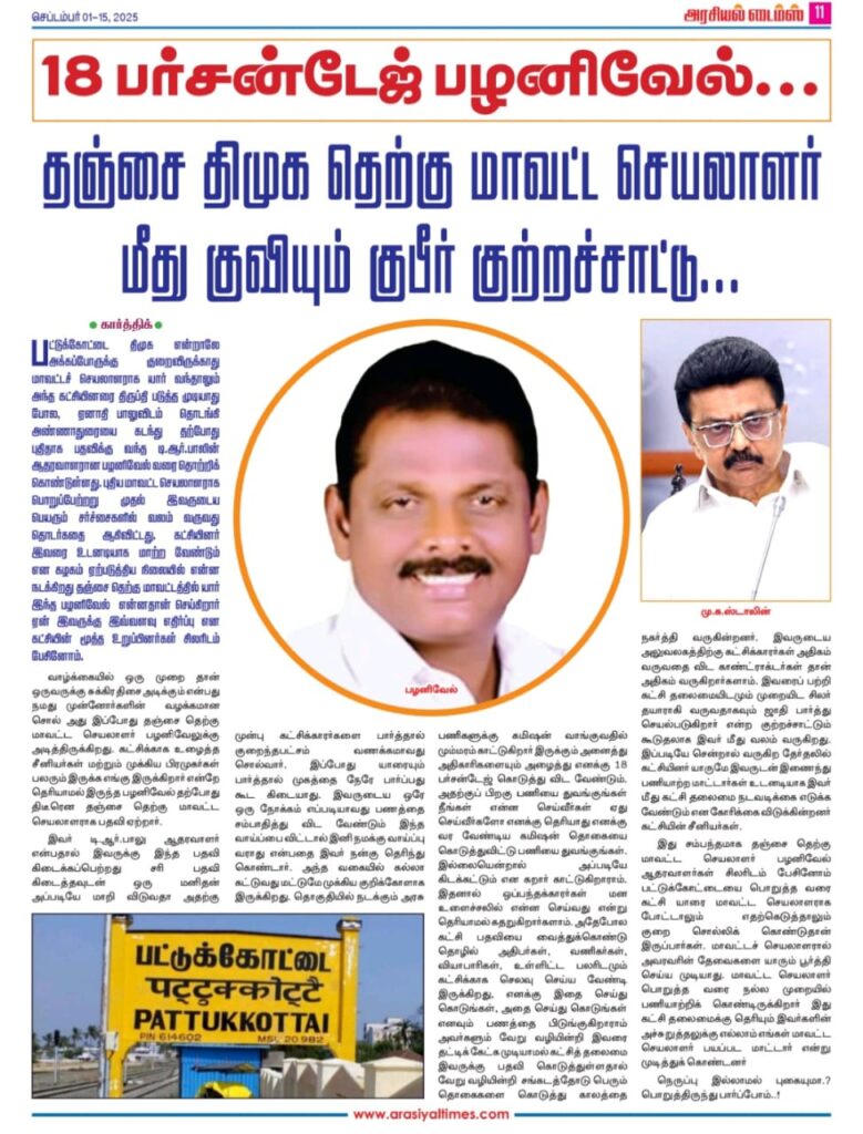 18 பர்சன்டேஜ் பழனிவேல்… தஞ்சை திமுக தெற்கு மாவட்ட செயலாளர் மீது குவியும் குபீர் குற்றச்சாட்டு…